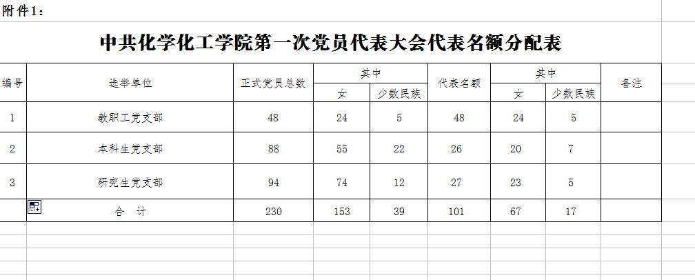这次代表大会代表名额为101名。各类代表指导性比例为:其中教工党员48名(全体参加,占党员代表总数的47.5%),学生党员53名(选举产生,占党员代表总数的52.5%),妇女党员67名(不低于学院妇女党员占正式党员总数的比例),少数民族党员17名(不低于学院少数民族党员占正式党员总数的比例)。党员代表按学院党支部分配名额选举产生。上述比例除妇女和少数民族代表比例外,其他均为指导性比例。