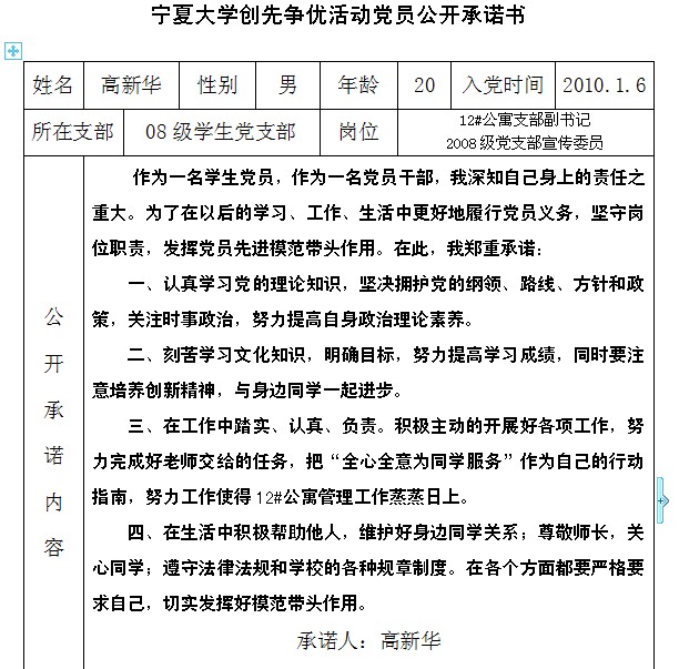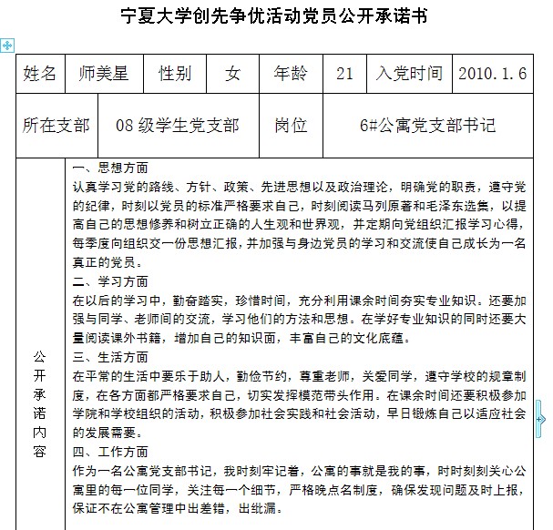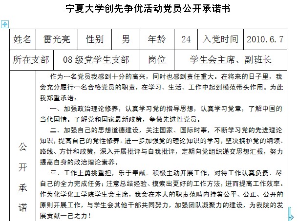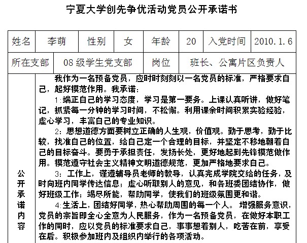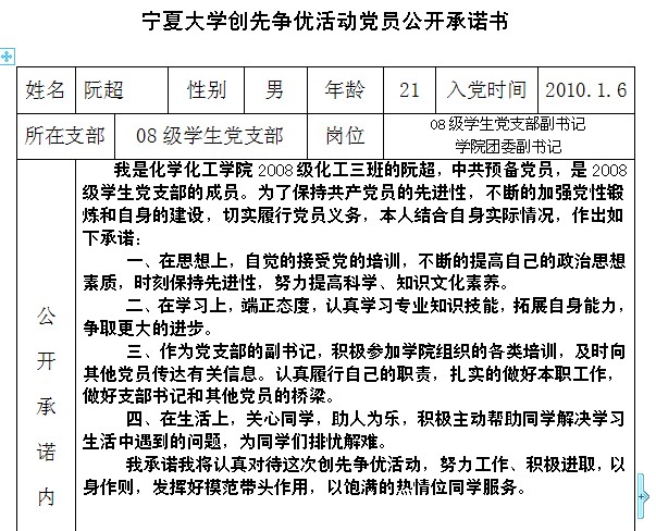 葡京娱乐场 创先争优活动党员公开承诺书(2008级党支部)
