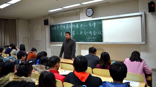 于北教122室召开团委学生会传媒中心自律委员会全体会议。党委副书记桂晓兵、刁俊,学生工作办公室辅导员王艳梅、马洁出席本次会议,全体学生干部参加了会议。会议由桂晓兵副书记主讲。