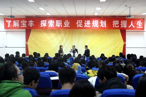 此次活动的主题是“了解宝丰,探索职业,促进规划,把握人生”。贺浒浜总监就宝丰集团的招聘政策和发展战略为学生们进行了介绍,他一再强调企员工的诚信和责任感是企业最看重的方面。化院毕业生张占兵介绍了自己在宝丰的应聘经历和职业发展历程,他寄语学弟学妹们要对自己的大学生活有明确的规划,了解所学专业,要养成努力、坚持、勤奋的品质。贺浒浜总监及张占兵学长细致全面地回答了主持人所提的关于企业的安全生产、国家政策支持、员工工作环境及职业发展途径等问题,在场观众认真倾听,时而热烈鼓掌,整场气氛热烈。
