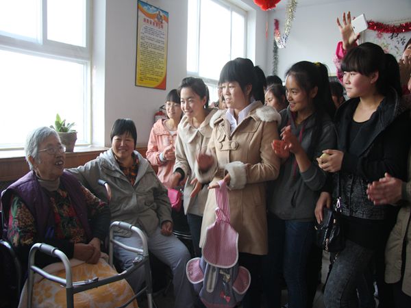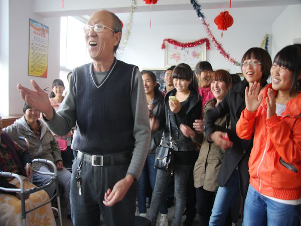 接下来,同学们为老人表演了节目。表演过程中,老人们随着同学的表演高兴地敲打着节拍。其中一些老人还为同学们唱起了《东方红》《青藏高原》等歌曲,使现场的气氛达到了高潮。告别时,老人们好像很不舍得的样子,站在门口与我们告别,希望我们能够下次再来,我们都满口答应。