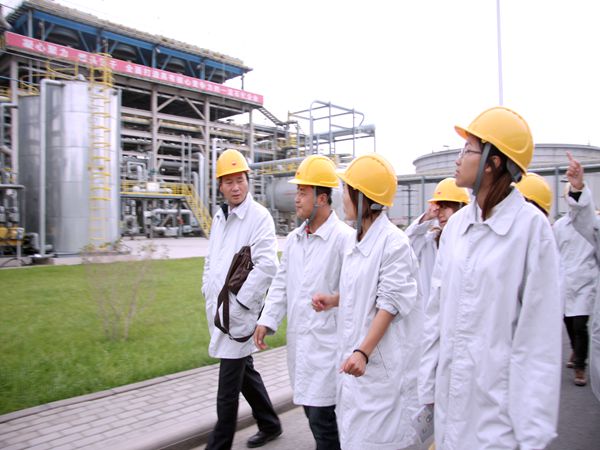 简短的座谈会后,场接待员工根据安全需要,分发了安全帽、工作服。大家穿戴整齐,在几位工人师傅带领下开始了参观活动。一进入厂区,高大的机械厂房,化工设备无不令人惊叹,一路上同学们围绕在工人师傅周围,认真听取他们的介绍。他们手指眼前的设备厂房向同学们介绍每个车间的工艺流程和他们的基本工作内容,每个环节都深深地吸引着同学们。