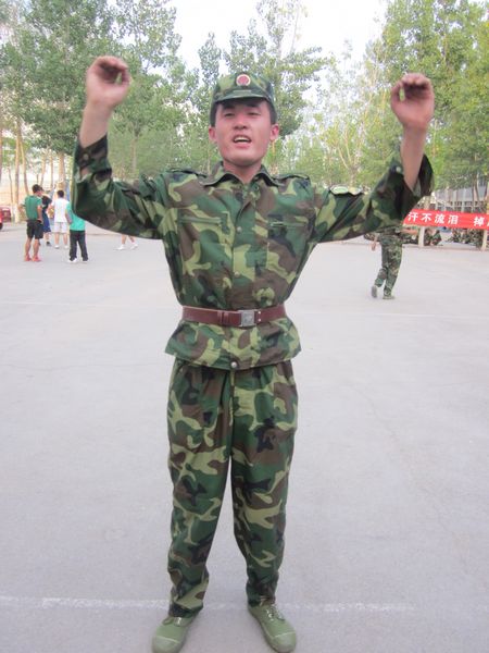 “不抛弃,不放弃!坚持到底!”排长李鹏八尺有余,而形貌昳丽。朝服衣冠,奔跑于操场上,引无数晨练小兵尽折腰。这个小伙子,总是满怀年轻人的热血澎湃,有他在的一排总是热闹非凡,士气冲天。休息的时候,此排的军歌总是唱不完,也绝对是唱的最响的,李排长还时不时的挑逗一下隔壁的兄弟排,自己唱的激情四射,人家愣是一句不回。我是战士我怕谁?无畏无惧争荣誉。蚊子骚扰给你打蚊子,寂寞的时候给你唱军歌,渴了为你倒水……他像“六神”般的呵护着他的兵,驱除着酷暑的焦躁难耐,信李排长者,得永生,必将如“神六”般一飞冲天!