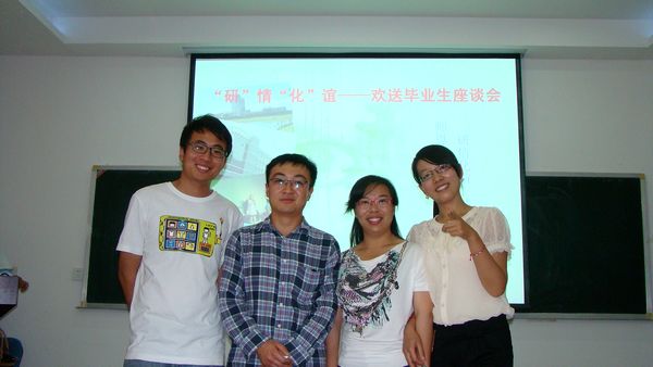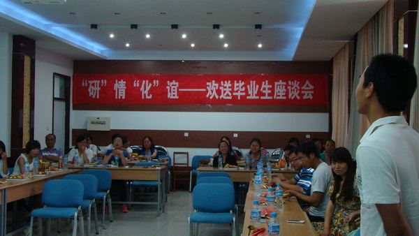 举办了“研”情“化”谊——欢送毕业生座谈会。学院主管研究生副院长倪刚老师、硕士生导师代表、研究生辅导员、2009级和2010级化学工程毕业研究生以及2010、2011级的研究生代表参加了此次座谈会。