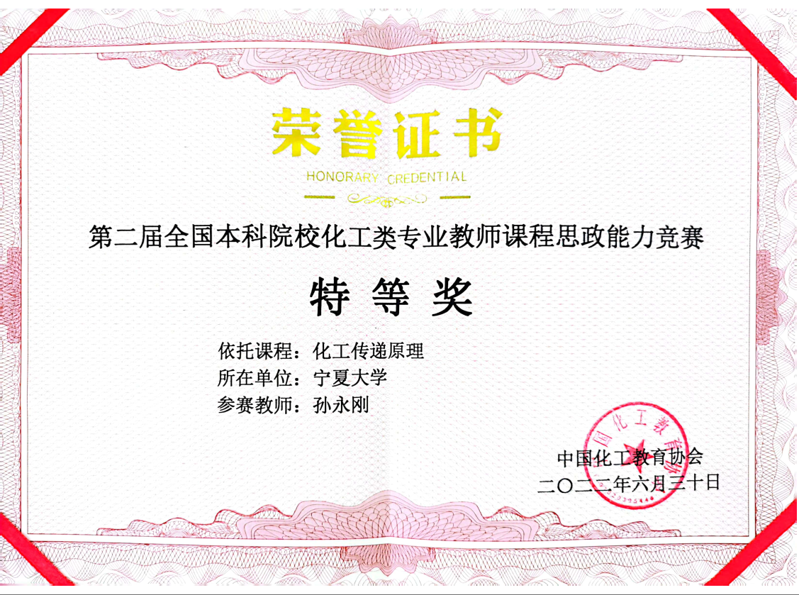 2022年6月,由中国化工教育协会主办,中国化工教育协会高校工作委员会和北京化工大学承办的2022年第二届全国高等院校化工类专业教师课程思政能力大赛落下帷幕,葡京娱乐场青年教师孙永刚在《化工传递原理》课程思政建设与教学能力竞赛中荣获特等奖。