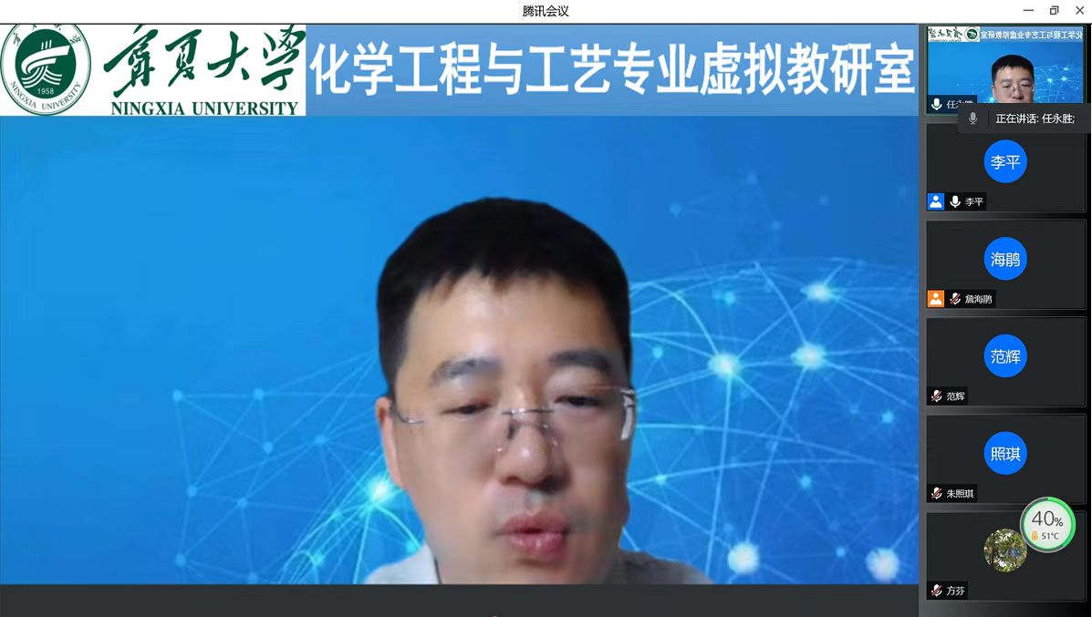 任永胜副院长介绍了学院发展及学科教学情况,“化学工程与工艺专业虚拟教研室”负责人李平教授介绍虚拟教研室情况,并做未来虚拟教研室工作倡议。虚拟教研室合作单位上海交通大学、华东理工大学、天津大学、西北大学、石河子大学及兰州理工大学相关教师在会议中做表态发言。