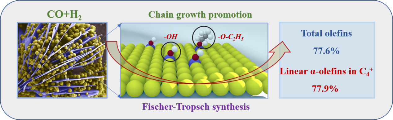 近日,葡京娱乐场“煤基应用催化”团队在合成气催化转化线性α-烯烃研究方面取得了新进展,设计了一种新型亲水层状Fe基催化剂,实现合成气在典型费托条件(280°C, 1.5 MPa)下转化为烯烃,其中线性α-烯烃(LAOs in C2+)选择性高达77.9%。相关研究成果发表在国际知名期刊《Fuel》(IF=8.035),论文题目:Highly selective formation of linear α-olefins over layered and hydrophilic Fe3O4/MAG catalysts in CO hydrogenation。论文的第一作者为葡京娱乐场2021届研究生刘波,通讯作者为高新华副研究员和张建利研究员。
