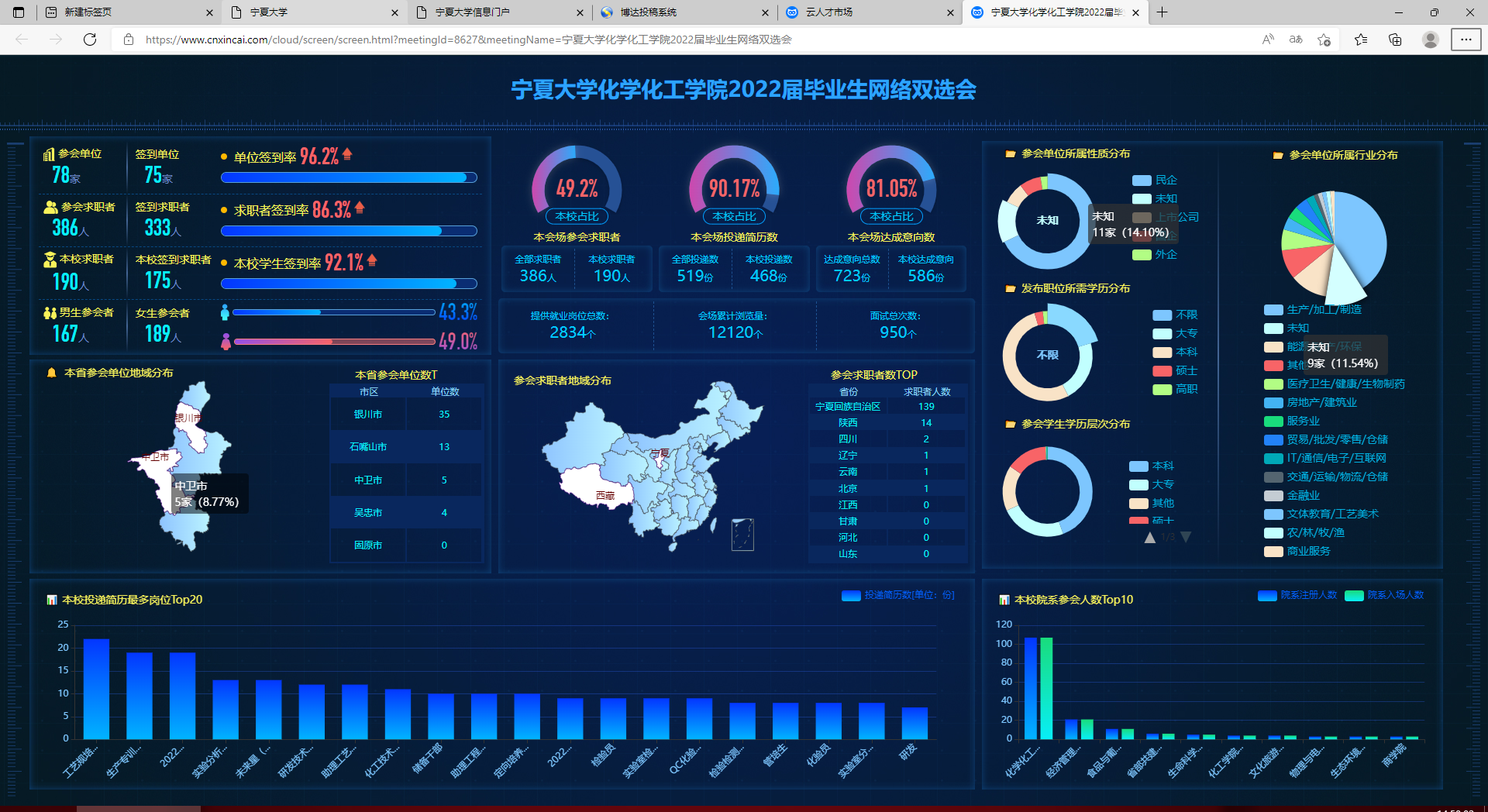 2022届毕业生踊跃参加线上应聘,积极调节求职心态,主动向用人单位推荐自己,展现化院学子积极、向上、自信、文明的精神风貌,各用人单位对葡京娱乐场学生给予了很高的评价。先后有500余人线上求职,投递简历468份,947人次与用人单位洽谈面试,385人次与用人单位达成初步求职意向。双选会还吸引了生命科学学院、土木与水利工程学院、经济管理学院、农学院、信息工程学院等兄弟学院的部分毕业生参加。