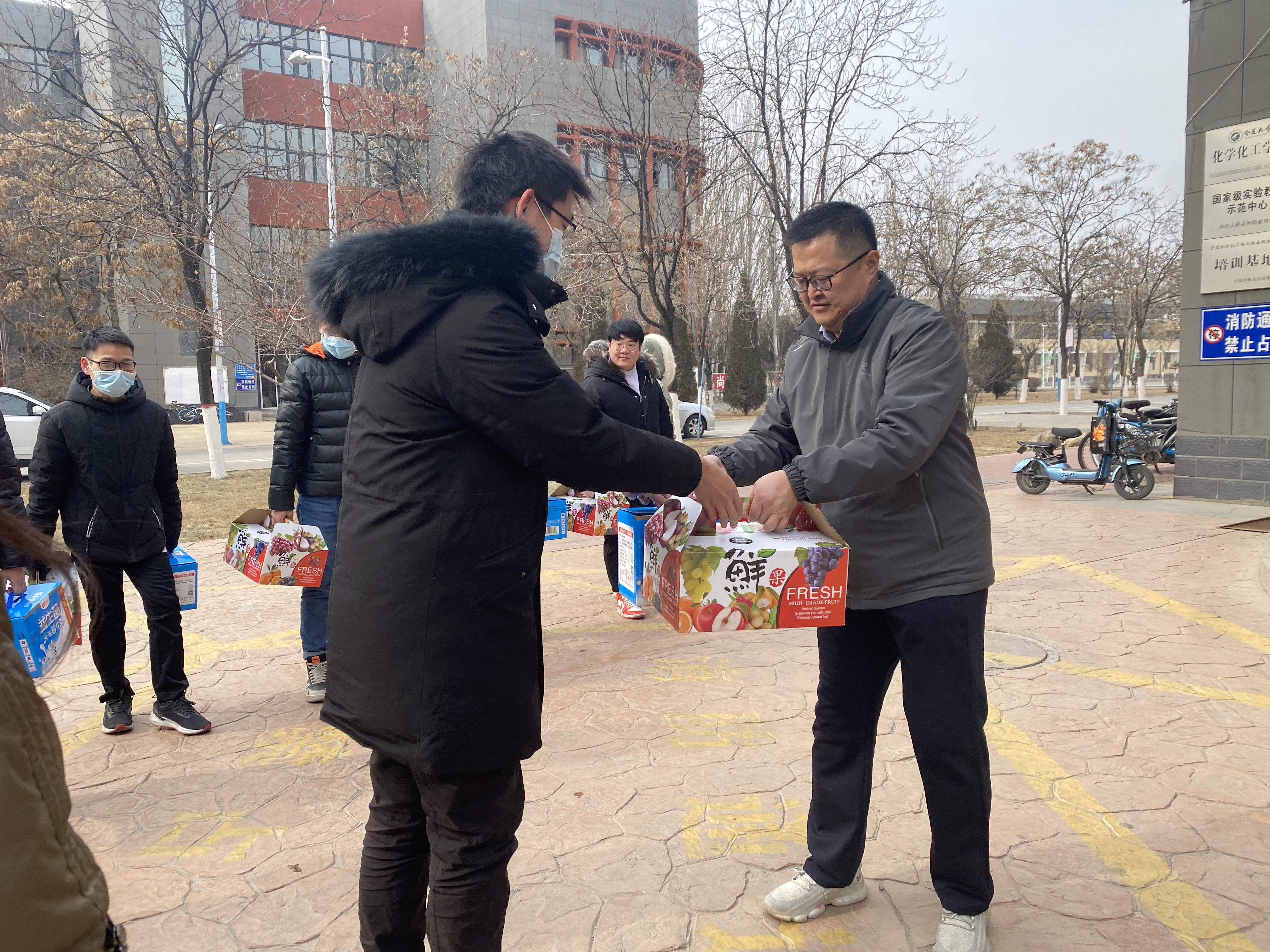 1月28日,学院党委书记高继明、副书记王兵、学生工作办公室辅导员马洁老师在文萃校区知化楼等候留宁过年和假期有科研任务的同学。高继明书记代表学院党委向各位同学致以诚挚问候和新春祝福,并为他们送上慰问品,给他们提前拜年,愿他们在新的一年里学业进步、生活幸福!