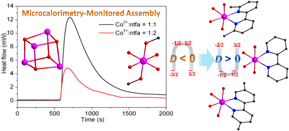 近日,葡京娱乐场刘翔宇副教授团队在分子磁体的制备及磁各向异性的研究方面取得了新进展,提出了原位量热实时监测分子磁体制备、利用辅助配体翻转磁各向异性的新策略。相关研究成果发表在国际知名期刊《Inorganic Chemistry Frontiers》(IF = 6.569, Top),论文题目:“Switching of easy-axis to easy-plane anisotropy in cobalt(II) complexes”, (DOI:10.1039/D1QI01208H.)