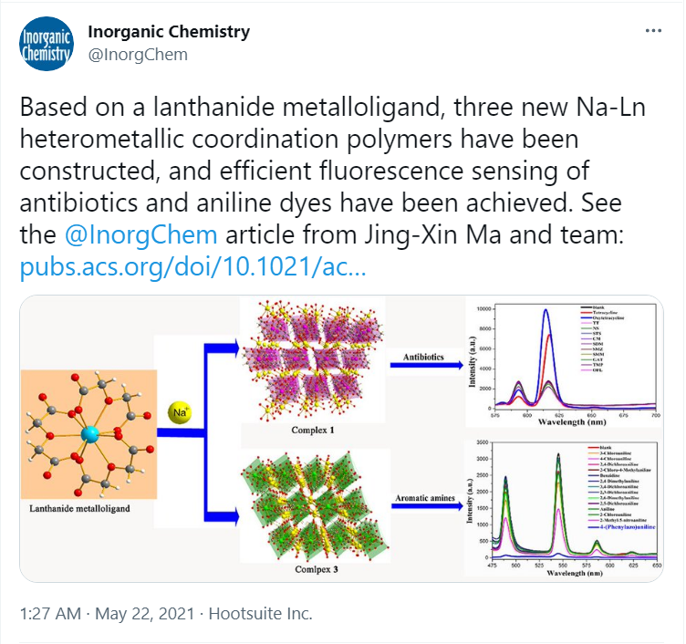 近日,葡京娱乐场马景新课题组在有机污染物荧光检测研究方面取得了新进展,研究成果发表于国际知名期刊《Inorganic Chemistry》。论文题目:“Na-Ln Heterometallic Coordination Polymers: Structure Modulationby Na+ Concentration and Efficient Detection to TetracyclineAntibiotics and 4‑(Phenylazo)aniline”,DOI:10.1021/acs.inorgchem.1c00462。