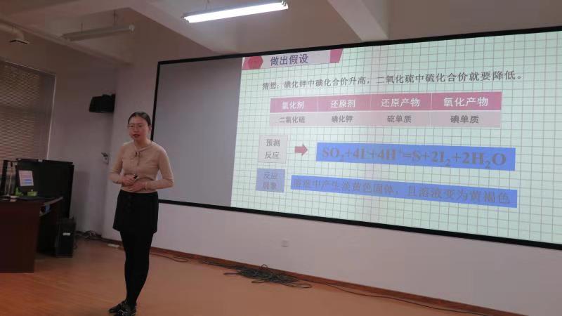 进行优秀作品展示的3位同学是参加“第七届全国教育硕士学科教学(化学)专业教学技能大赛”的获奖选手。此次作品展示采用“同课异构”的教学方式。选取了人教版高中化学必修课本中的“氧化还原反应”、“硫和氮的氧化物”、“化学反应的速率和限度”3个课题,每个课题均有3位同学模拟中学课堂教学。3位同学教学风格各异,特点突出:徐琳的作品均采用项目式教学的教学模式,在教学过程中注重教学场景的设计,利用国学知识,并结合现代科学技术—电子放大镜,在项目探究中完成对知识的逐步学习;徐建菊的作品都借助了手持技术实验、微距摄影技术、NOBOOK化学虚拟仿真软件,使得实验现象可视化、定量化,凸显了现代技术在化学教学上的应用优势;芦瑞的3个作品注重实验的创新与学生的合作探究,以小组活动为主,突出以学生为主体,教师为主导的教学思想,培养学生的学科核心素养,创新意识。