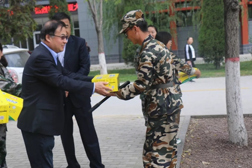 党委书记马玉龙、国家重点实验室主任郭庆杰、副书记桂晓兵、副院长王政、任永胜,在新生辅导员马丽蓉、马洁老师的陪同下来到军训场地,代表全院一百三十多名老师,给酷暑中训练的新生们送去关怀。