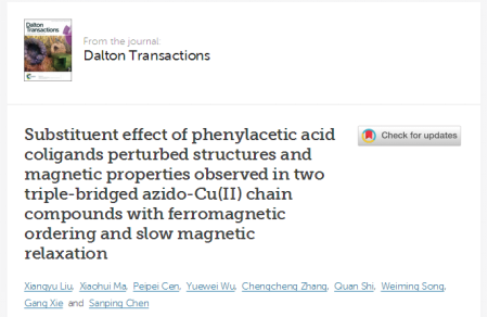 相关研究成果“Substituent effect of phenylacetic acid coligands perturbed structures andmagnetic properties observed in two triple-bridged azido-Cu(II) chain compounds with ferromagnetic ordering and slow magnetic relaxation”,在线发表于英国皇家化学会(RSC)旗下国际知名期刊《Dalton Transactions》(影响因子4.177)[Dalton Trans., 2017, Accepted Manuscript,DOI:10.1039/C7DT01338H]。全文链接://pubs.rsc.org/en/content/articlelanding/2017/dt/c7dt01338h#!divAbstract。研究工作获得了国家自然科学基金项目(No. 21463020)以及“化学工程与技术”国内一流学科的资助和支持。