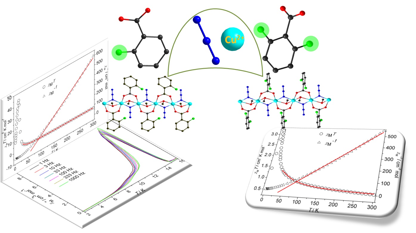 由葡京娱乐场刘翔宇副教授、宋伟明教授合作开展的一维铜基分子基磁体的设计合成及磁性研究最近取得了新进展。分子基磁体作为一种新型的软磁材料在低温超导材料、磁感应、信息记录、微波材料和航天等领域有广泛的用途。课题组设计并合成了两例苯甲酸-叠氮铜链状化合物,深入研究了目标物的磁性能,并且通过理论计算定性的分析了磁耦合作用。研究工作的亮点是基于F取代基数量不同的两个苯甲酸微调了两例叠氮铜化合物的结构,进而对磁性能产生了较大影响,其中一例化合物呈现了慢磁弛豫和铁磁有序的分子基磁体特性。