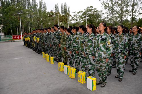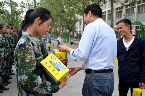 随后,各位领导老师将精心准备的慰问品一一分发到各位同学手中,并与大家亲切交谈,了解同学们在军训中的困难与趣闻,使全体受训师生深受鼓舞和激励。