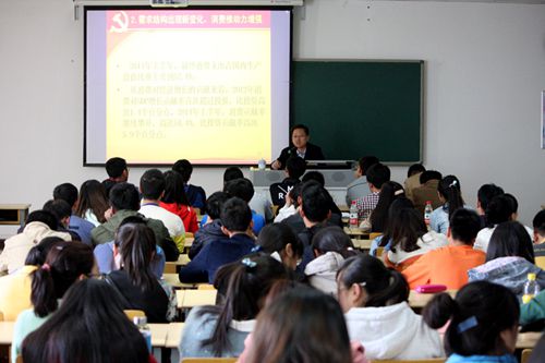赵书记从“中国梦”、“两个一百年”入手,围绕全面建设小康社会的奋斗目标、促进经济发展新常态的新背景展开讲座。他指出,中国梦归根到底是人民的梦,值得每一个中国人关注,青年学生要坚定理想信念,要把个人的具体梦想与国家、社会发展,振兴中华紧密联系起来。赵书记就自己学习习近平总书记系列重要讲话的学习心得与在座的学生党员进行了交流,针对“全面小康社会的指标体系”的内容,学生党员们就民生、文化、经济、生态等方面发表了自己的见解。随后,赵书记以十八大以来习近平同志关于经济工作的重要论述为重点,带领在座党员学习了习近平总书记提出的经济发展“新常态”这一概念,图文并茂的展示了“新常态”的新背景。最后,赵书记表示,大众创业已经成为经济增长新引擎,鼓励同学们积极创业,在实现中国梦的实践中放飞青春梦想。