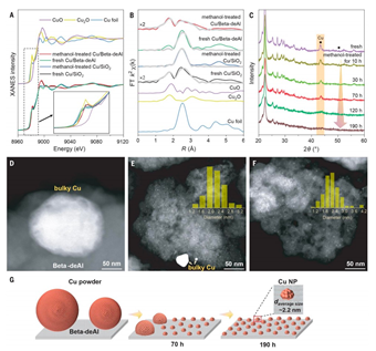 研究团队将脱铝的Beta沸石分子筛作为载体,调控铜纳米颗粒在催化反应中的动态演化进程,消除铜颗粒烧结、并控制已经烧结铜纳米颗粒进行二次分散,从而大幅延长催化剂的寿命。研究团队认为,这种基于调控动态演化过程的方案兼顾了催化剂的稳定与活性,有望应用于发展更多耐久型催化剂。
