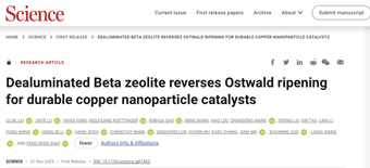 、省部共建煤炭高效利用与绿色化工国家重点实验室高新华博士参与合作的论文“Dealuminated Beta zeolite reverses Ostwald ripening for durable copper nanoparticle catalysts”在《Science》发表。文章提出一种新的催化剂设计策略:在弱相互作用载体表面设计相对强作用位点,捕获反应气氛诱导的金属颗粒奥斯特瓦尔德熟化(Ostwald Ripening)中间体,以形成新的成核中心并逆转传统金属颗粒的烧结过程。