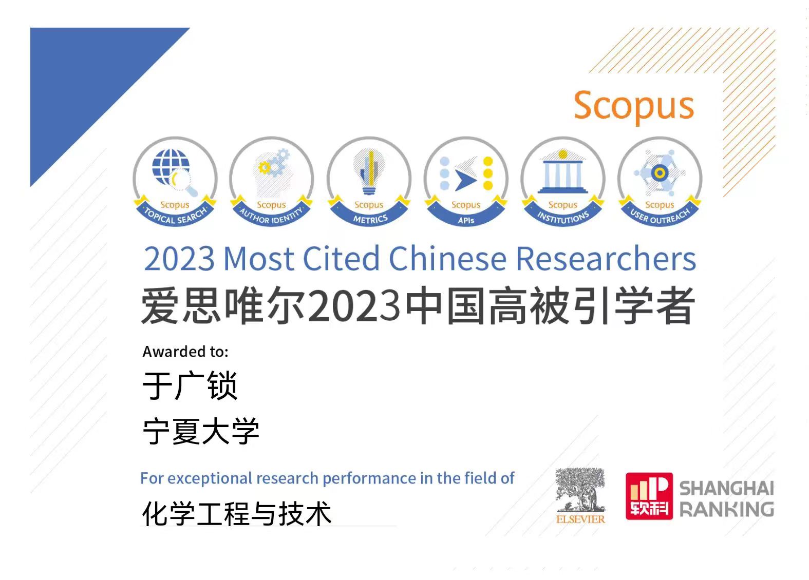 于广锁教授入选“化学工程与技术”领域高被引学者榜单。这是于广锁教授自2018年入职葡京娱乐场