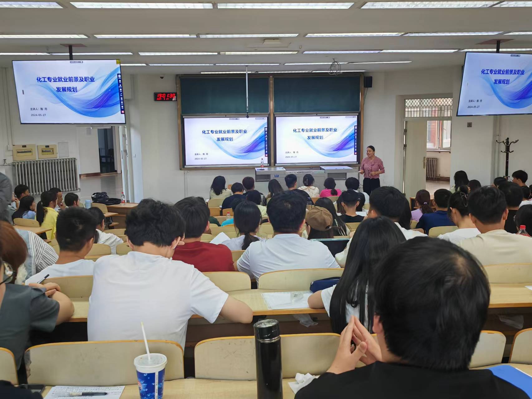 优秀校友的职业发展的案例,给同学们分析了企业S、T、M三类不同岗位人员的职业发展路线和自我社会价值的实现,同时也对化工专业人才需要具备的核心能力和素质进行解读,强调了具备终身学习能力的重要性。最后,陈部长还给同学们分享了企业招聘信息的获取、笔试及面试的技巧等。