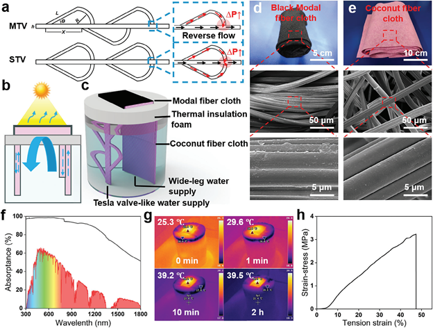 该研究开发了一种具备特斯拉阀式水传输结构的太阳能蒸发器,有效解决了被动式太阳能界面蒸发技术中的盐积累难题。研究人员借鉴特斯拉阀的流体控制机制,设计了这一新型蒸发器,通过优化不对称水传输结构,实现了“离子二极管”盐阻抗效果。实验数据显示,在16wt% NaCl溶液中,该蒸发器的蒸发速率高达3.25 kg∙m⁻²∙h⁻¹,光热转化效率达到83.27%。这项研究为提高太阳能界面蒸发技术的长效稳定性提供了新的理论和技术支持。