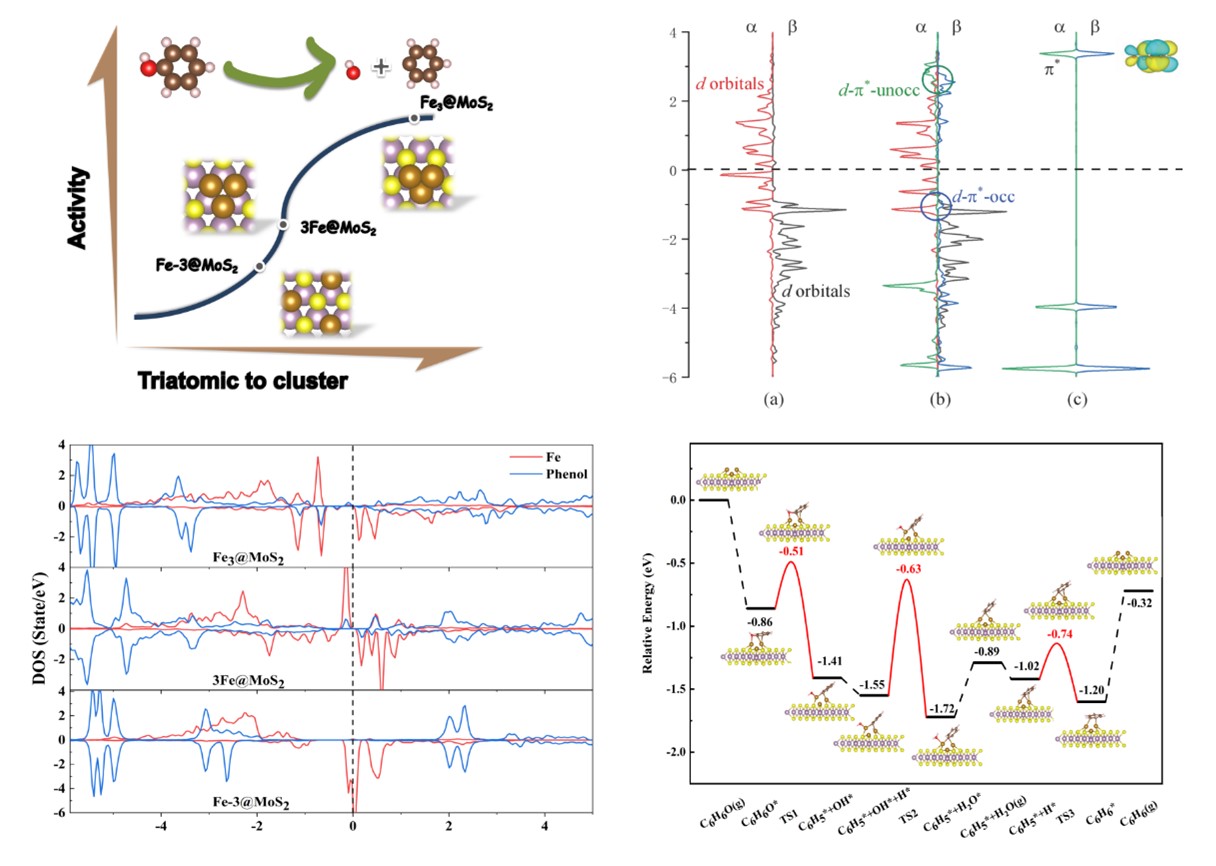 近日,葡京娱乐场多尺度模拟计算科研团队在化学工程领域顶级期刊Chemical Engineering Science上发表了题为“Fe3cluster-anchored monolayer MoS2for direct deoxygenation of phenol: catalyst design and activation mechanism”的研究论文。论文第一作者为2022级材料化工专业硕士研究生马佳丽同学,通讯作者为王鑫博士和刘兴满博士。