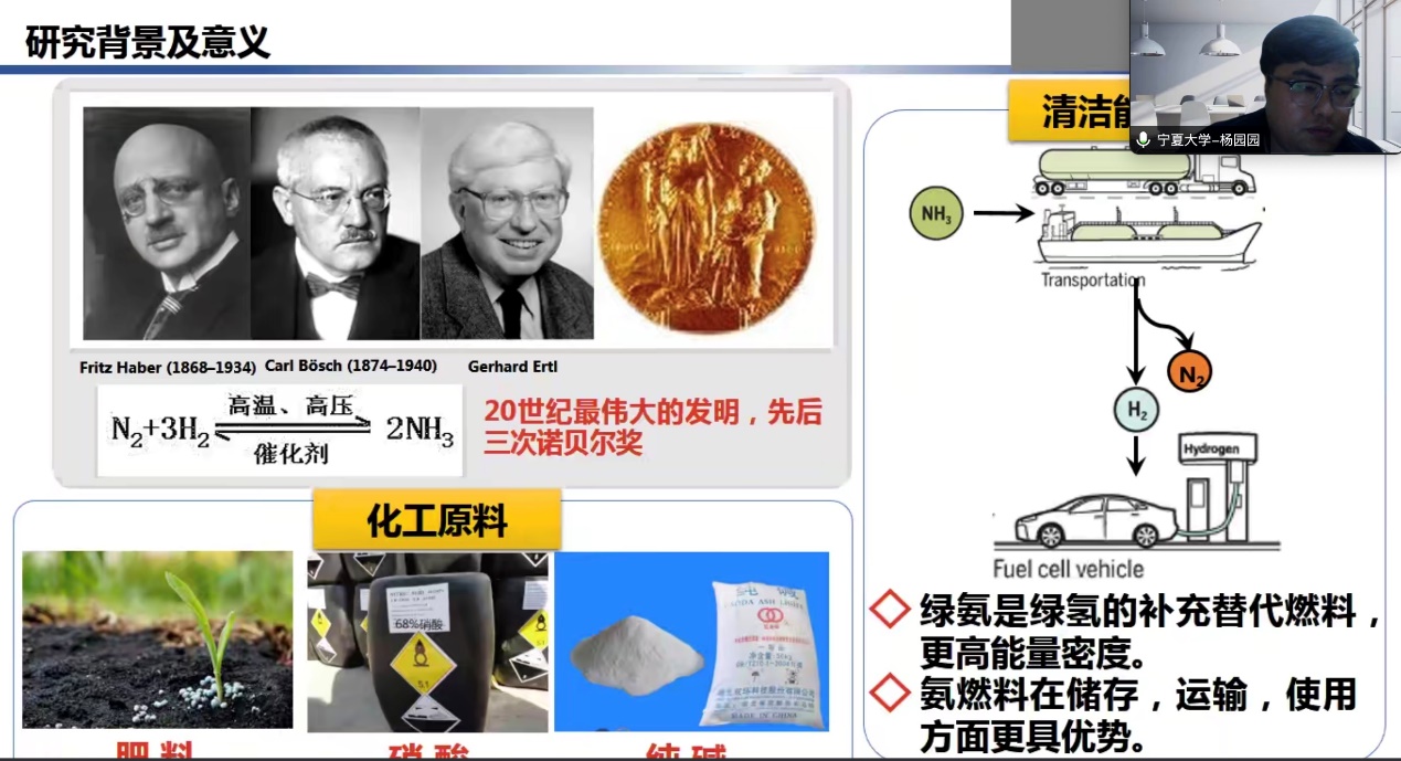 杨园园博士以“电催化固氮材料与机理分析”为题,针对电催化固氮反应中N2分子难吸附、氮氮三键难活化加氢,以及反应势垒较大等问题,围绕催化位点与反应活性之间构效关系进行了探究,为构建新型电催化固氮材料和设计新颖加氢反应机制提出新思路。