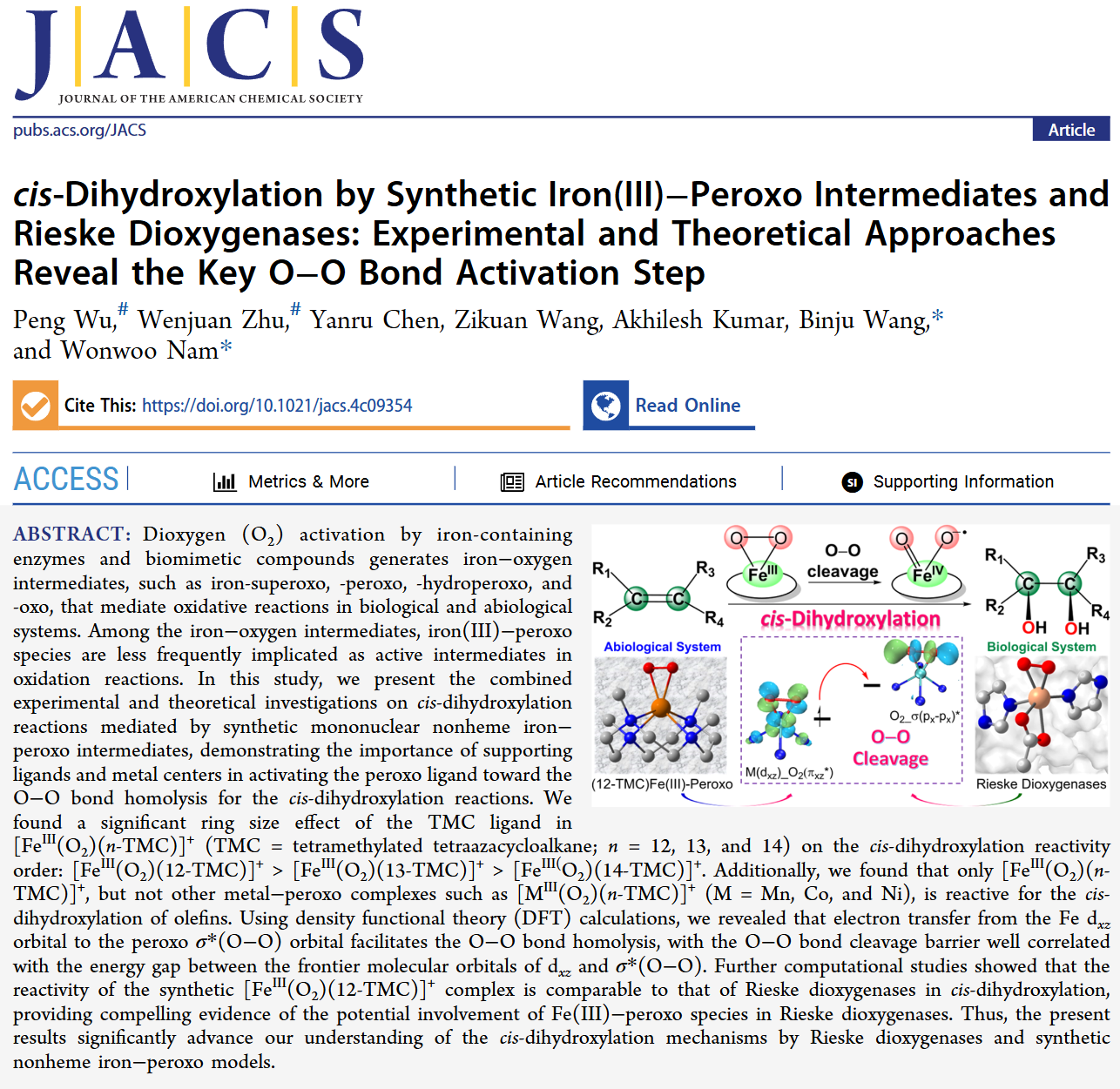 近日,葡京娱乐场吴鹏博士与厦门大学、梨花女子大学合作在化学领域顶级期刊Journal of the American Chemical Society上发表了题为“cis-Dihydroxylation by Synthetic Iron(III)–PeroxoIntermediates andRieskeDioxygenases: Experimental and Theoretical Approaches Reveal the Key O–O Bond Activation Step”的研究论文。论文第一作者为吴鹏博士,通讯作者为厦门大学王斌举教授和梨花女子大学WonwooNam教授,葡京娱乐场