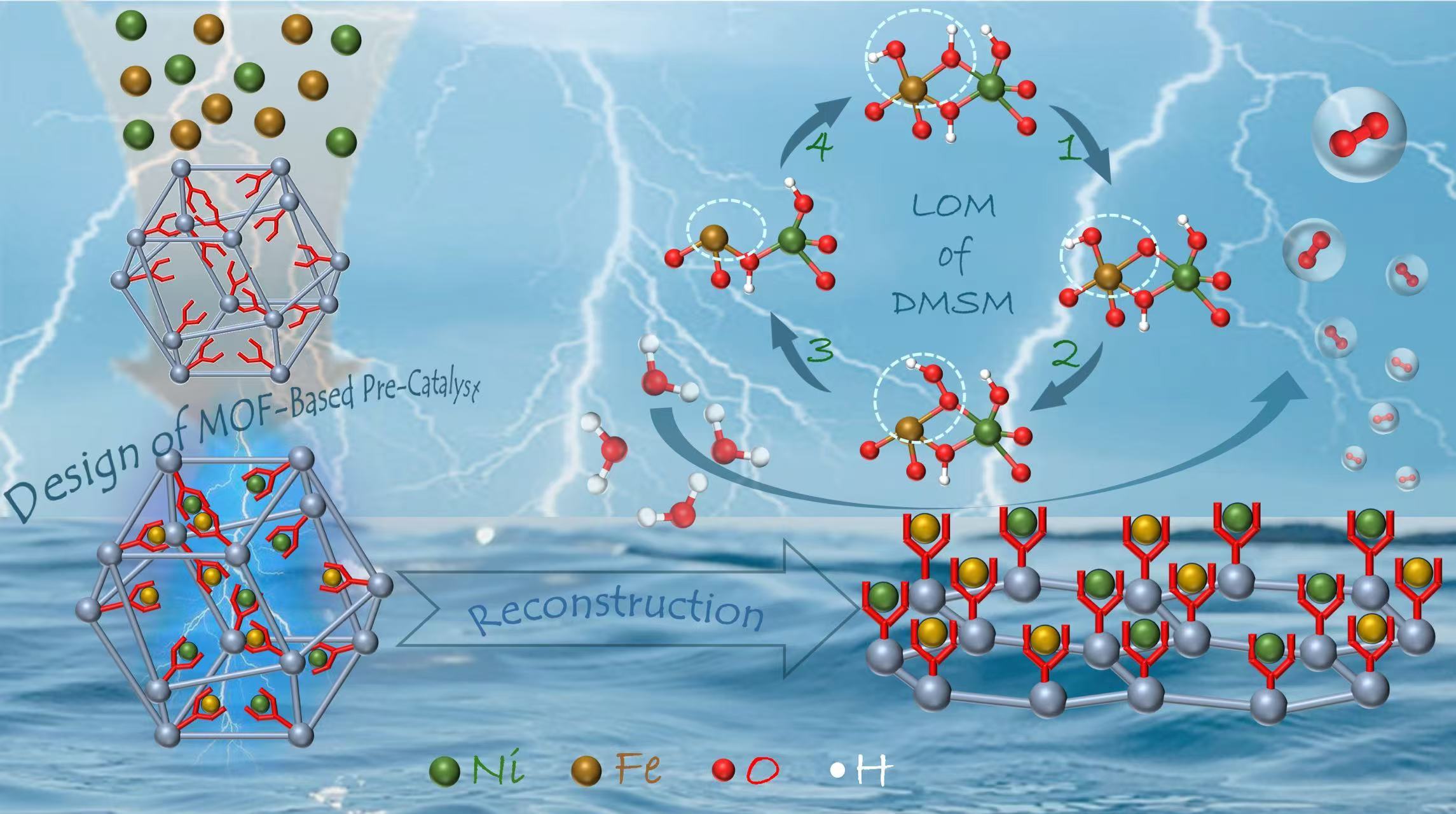 本工作设计合成了一种2-羟基膦乙酸(HPAA)修饰的MOF-808材料微型吸附剂,能够有效地锚定金属离子Fe3+和Ni2+。通过原位电氧化动态重构形成了具有良好OER活性的R-MOF-HPAA@FeNi电催化剂,在10 mA cm−2下具有低过电位(272 mV)和超300小时的长期稳定性。实验和理论计算表明,由于HPAA的螯合作用,重构后的R-MOF-HPAA@FeNi催化剂的双金属活性位点Fe/Ni在二维超薄Zr(OH)4片上呈现原子级分布。实现了晶格氧参与的高效稳定氧析出,表现出晶格氧机制和双金属位点机制(DMSM)。本工作为基于MOF的预催化剂的设计合成和合理利用结构重构来实现高效OER活性提供了新思路。