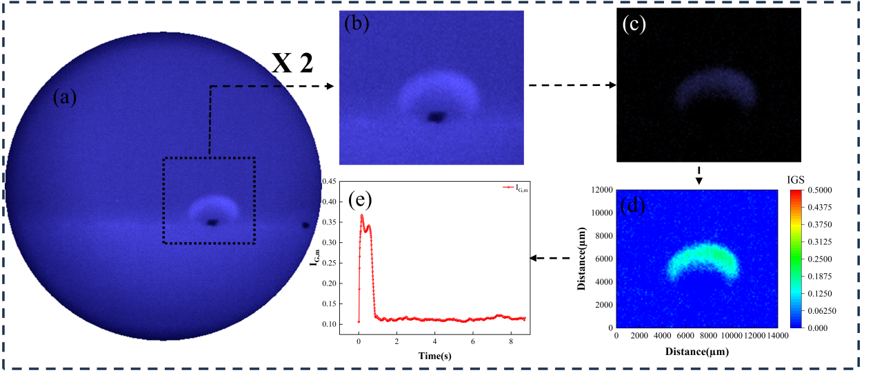 图1. CH*二维分布代表性图像处理过程(a)原始图像;(b)提取的图像的一部分;(c)删除背景后的图像;(d)CH*强度的二维分布;(e)随着时间的推移峰值强度变化。