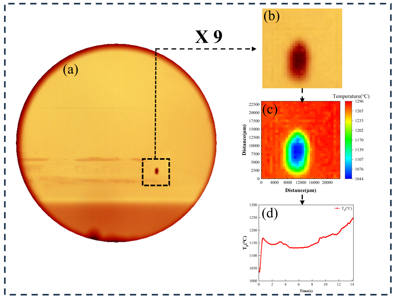 图2.熔渣壁面颗粒温度二维分布处理过程(a)原始图像;(b)提取图像的一部分;(c)颗粒温度的二维分布;(d)随着时间的推移颗粒温度的变化情况。