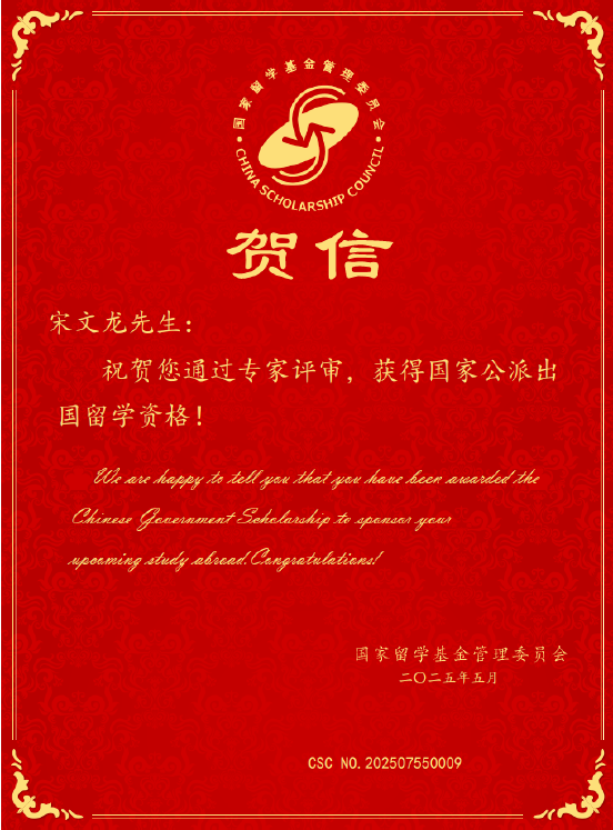 近日,国家留学基金管理委员会(CSC)2025年公派留学项目录取结果揭晓。葡京娱乐场博士研究生宋文龙(硕博连读)在张建利研究员、王康洲副教授和高新华研究员的悉心指导下成功获得"国家建设高水平大学公派研究生"项目资助,将以联合培养博士研究生身份赴日本国立富山大学(University of Toyama)深造,标志着葡京娱乐场国际化人才培养再结硕果。