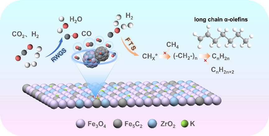 该研究工作针对现有Fe基催化剂在CO2加氢制线性α-烯烃(LAOs)反应中活性相不稳定的关键问题,创新性的提出通过构建FeZr-Fe5C2界面稳定碳化铁,并促进CO*中间体在催化剂表面的吸附,有效调控了Fe5C2活性位点上的C-C偶联反应,实现了CO2加氢制LAOs的高效转化。同时,结合多种表征结果明确了催化剂的构效关系。本研究为合理设计高效稳定的CO2加氢催化剂提供了有益的见解。