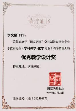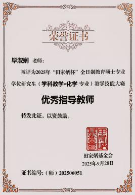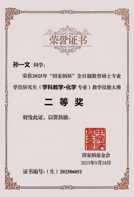 2025年9月26日至28日,全国“田家炳杯”全日制教育硕士专业学位研究生学科教学(化学)教学技能大赛决赛在哈尔滨师范大学举行。本次大赛汇聚了来自全国众多高校的优秀学子同台竞技。经过激烈角逐,葡京娱乐场学子表现优异,载誉而归。其中2024级学科教学(化学)专业硕士研究生孙一文荣获二等奖,李文星、李道燃荣获“优秀教学设计奖”,毕淑娴老师被评为“优秀指导教师”。