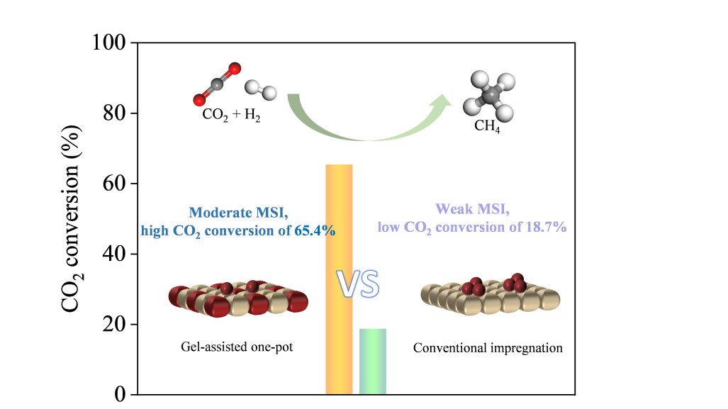 研究通过调控镍基介孔催化剂(Ni/TUD-1)的金属–载体相互作用(MSI),系统探究了其催化性能与结构之间的构效关系。结果表明,采用凝胶辅助一锅法所制备的催化剂具有较小的镍颗粒尺寸与适中的MSI强度,有效抑制了反应过程中活性组分的迁移与团聚。在225 °C的低温条件下,该催化剂实现了65.4%的CO2转化率,并在连续运行156小时后未出现明显失活,表现出优异的催化稳定性。该研究为开发高效、稳定的低温CO2甲烷化催化剂提供了参考。
