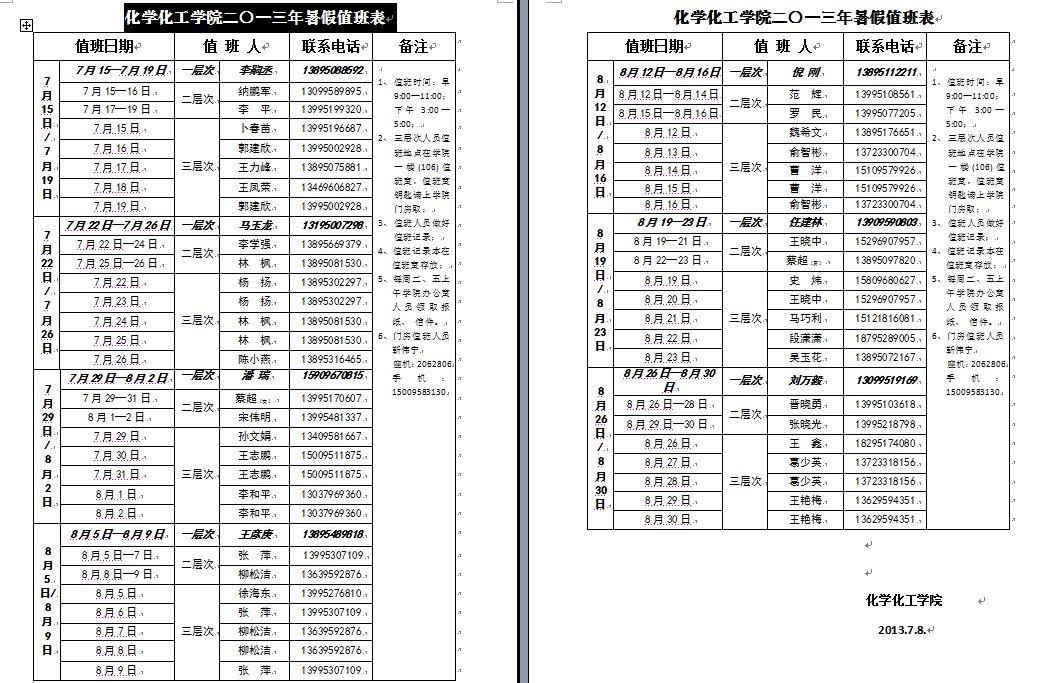 葡京娱乐场 二〇一三年暑假值班表