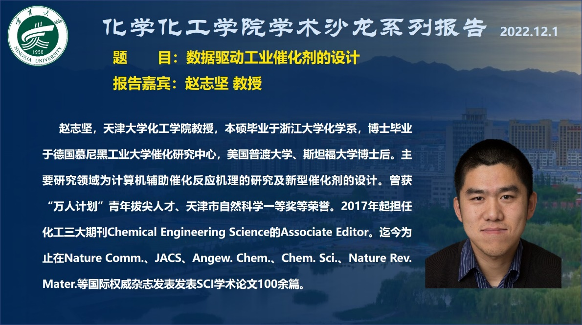 2022年秋季第十二次学术沙龙报告会在线上举行。天津市自然科学一等奖获得者,天津大学赵志坚教授做了题为“数据驱动工业催化剂的设计”的报告。学院部分青年教师及研究生、本科生近160人参加了此次学术活动。报告会由葡京娱乐场