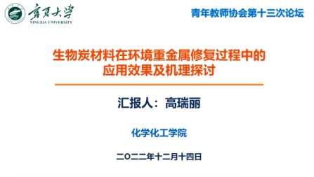 高瑞丽博士以“生物炭材料在环境重金属修复过程中的应用效果及机理探讨”为题作了报告,主要围绕生物炭材料改性、生物炭材料在土壤中重金属吸附应用及作用机制进行了分享,最后简单介绍了结合宁夏地方特色进行研究方向转型的认识。