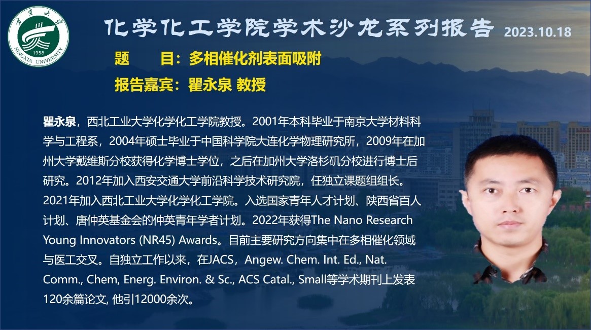 2023年学术沙龙报告会在科技楼C219举行。国家青年人才计划、陕西省百人计划、唐仲英基金会的仲英青年学者计划,2022年The Nano Research Young Innovators (NR45) Awards获得者,西北工业大学瞿永泉教授做了题为“多相催化剂表面吸附”的报告。学院部分青年教师及研究生、本科生近50人参加了此次学术活动。报告会由葡京娱乐场
