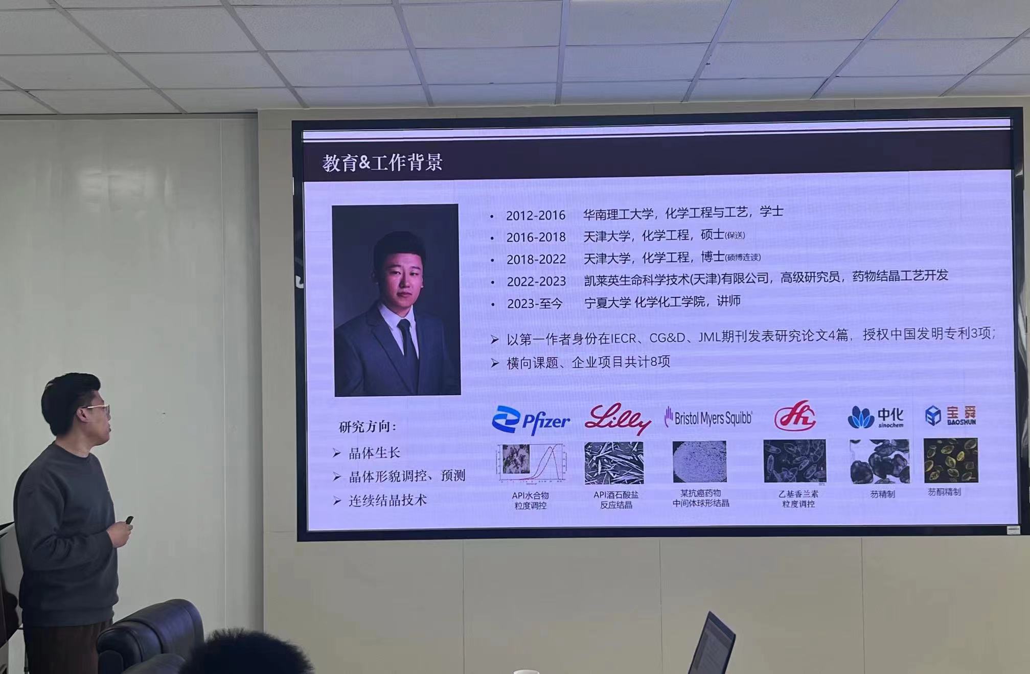随后,张世豪博士以“香兰素类化合物溶液结晶晶习控制及预测”为题,针对香兰素类化合物的应用需求,对其制备方法的选择和优化方面进行了细致分析,重点对结晶晶习控制及预测进行了探究,为香兰素类化合物的晶体生长及形貌调控预测提供了新思路。