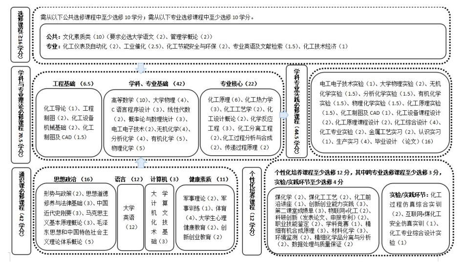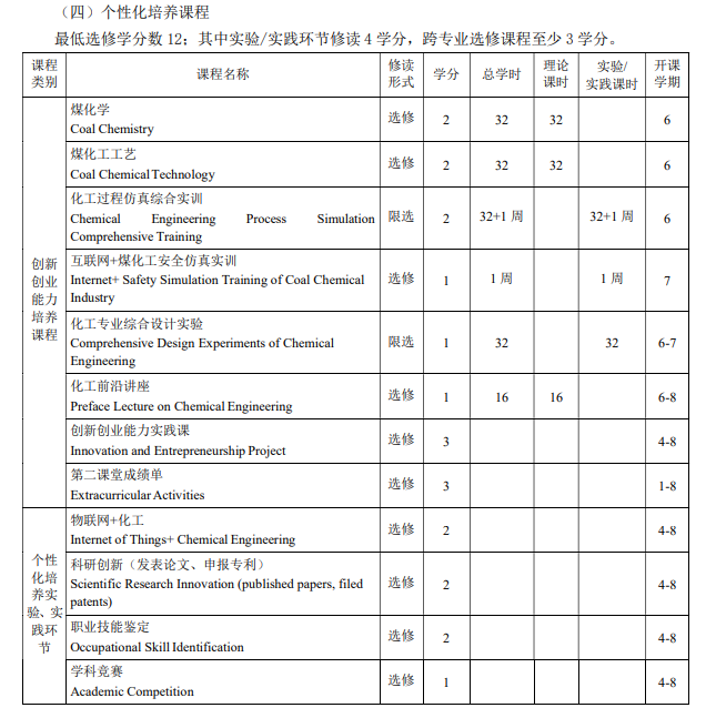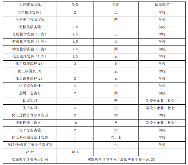 特色课程:化工专业实验、煤化学、煤化工工艺、认识实习、生产实习、化工综合设计、化工过程仿真综合实训、互联网+煤化工安全仿真实训、化工专业综合设计实验、毕业设计(论文)等。