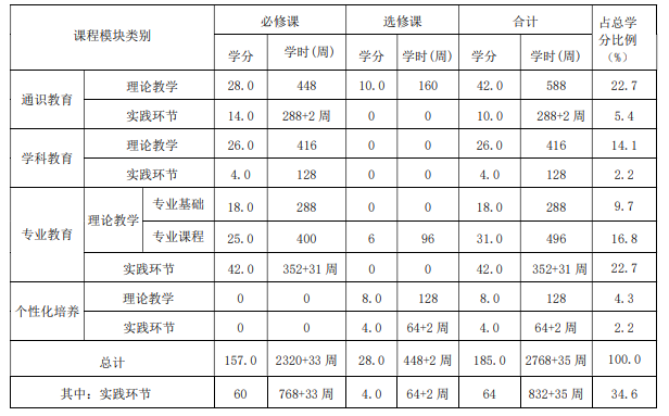 本专业学生必须修满 185 学分,达到国家规定的大学生体质要求(大学生体质健康测试不合格不能毕业),并达到以下知识、能力和素质要求。